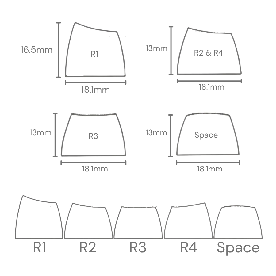 The 2u R1 keycap, located on the rightmost side of the top row, is one of the most beautiful keycaps on the board. It is just as tall as the other keycaps in Row 1 but twice as wide, which means that it is possible to acheive more visual depth in this keycap than any other. The 2u R3 keycap is used in the 17-key Numpad sets, and is the most visually distinctive key in those sets. All in all, these 2u keys play a strong role in the look and feel of your keyboard.